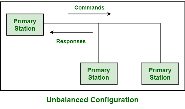 不平衡的配置:对于主站来说,通常需要采用不平衡配置。在这种配置中,有一个站点是主站点,而其他所有站点都是次级站点。这种配置主要是因为主站点通常被用作控制站点,以管理数据链路上的次级站点。此外,这种配置还包含两个或更多的次级站点。它支持以下操作:- 两种传输方式,即全双工和半双工。