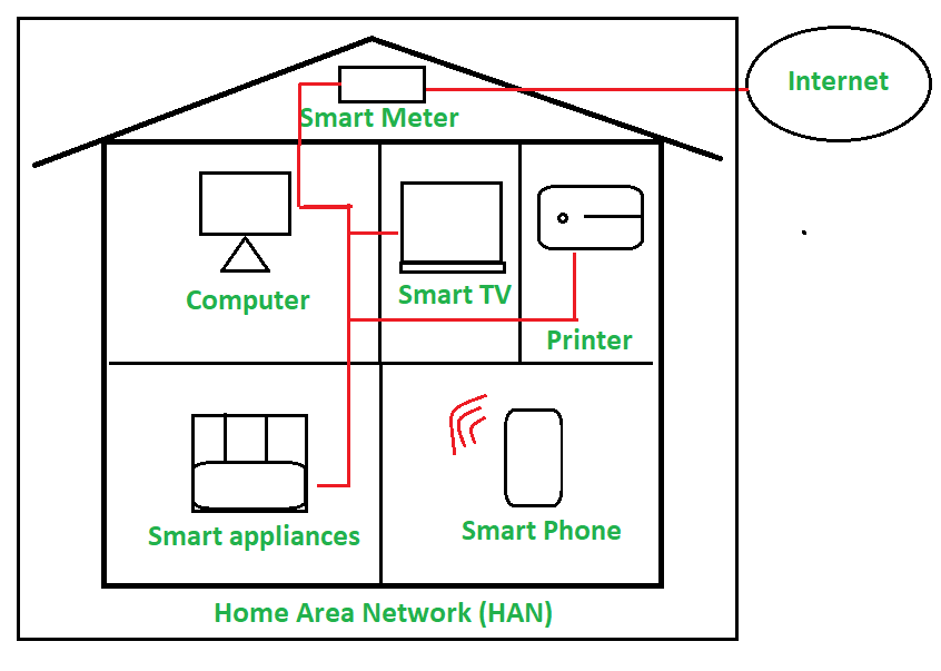 家庭局域网(HAN)这是一种存在于用户家中的网络系统,所有笔记本电脑、计算机、智能手机以及其他智能设备都连接到了这个网络中。 这有助于家庭内各个数字设备之间的通信,这些设备都连接到了家庭网络中。 家庭局域网可以采用有线或无线的方式实现。 大多数情况下,HAN都是使用无线网络来连接的。 有一个集中的设备负责执行网络地址转换的功能。 这个家庭局域网能够使得智能设备之间通过网络连接进行通信和资源共享。