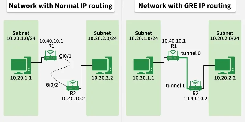 如果没有GRE协议,路由器则会根据其物理接口以及常规的IP路由方式来转发流量。不过,当配置了GRE协议时,情况就会有所不同了。