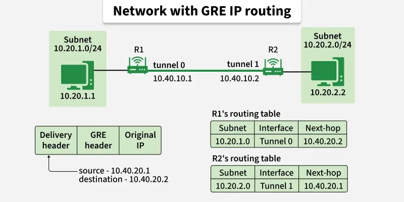 - 路由器R1接收到原始数据包后,将其封装成以下格式:→ GRE头部与传输头部(源地址:10.40.20.1,目标地址:10.40.20.2)。