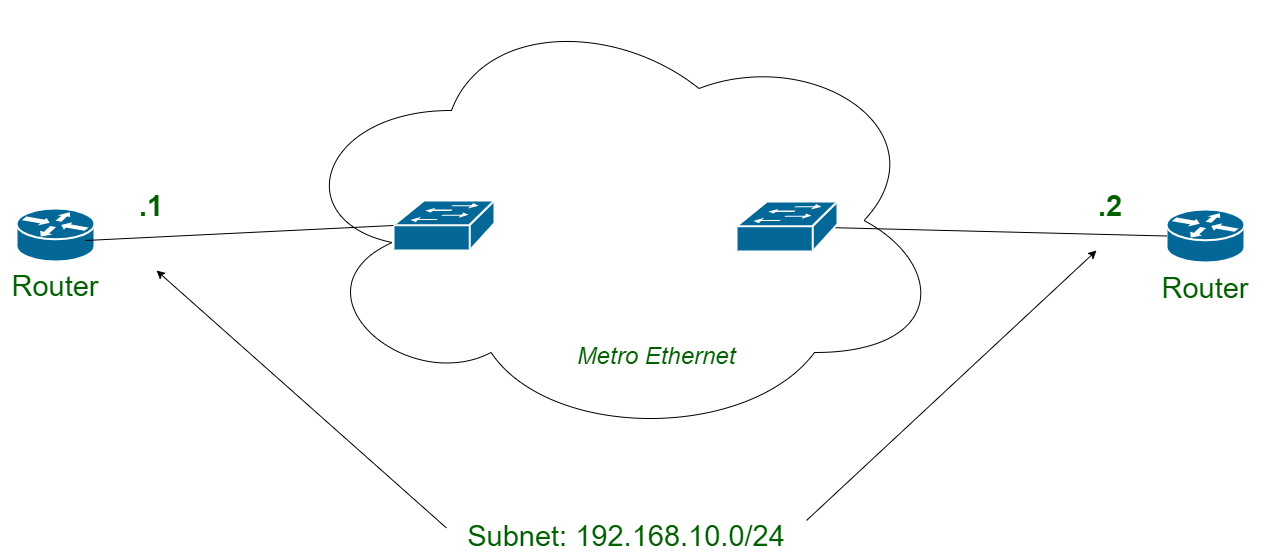 - 以太网线路服务(E-Line):这项服务适用于那些需要连接两个站点以实现帧传输的企业。可以说,这是一种用于实现通信功能的手段。从直观的角度来看,就像在两个站点之间有一根长的以太网电缆,而这两个站点之间会互相交换帧数据。两个设备之间的连接应该位于同一个子网内。