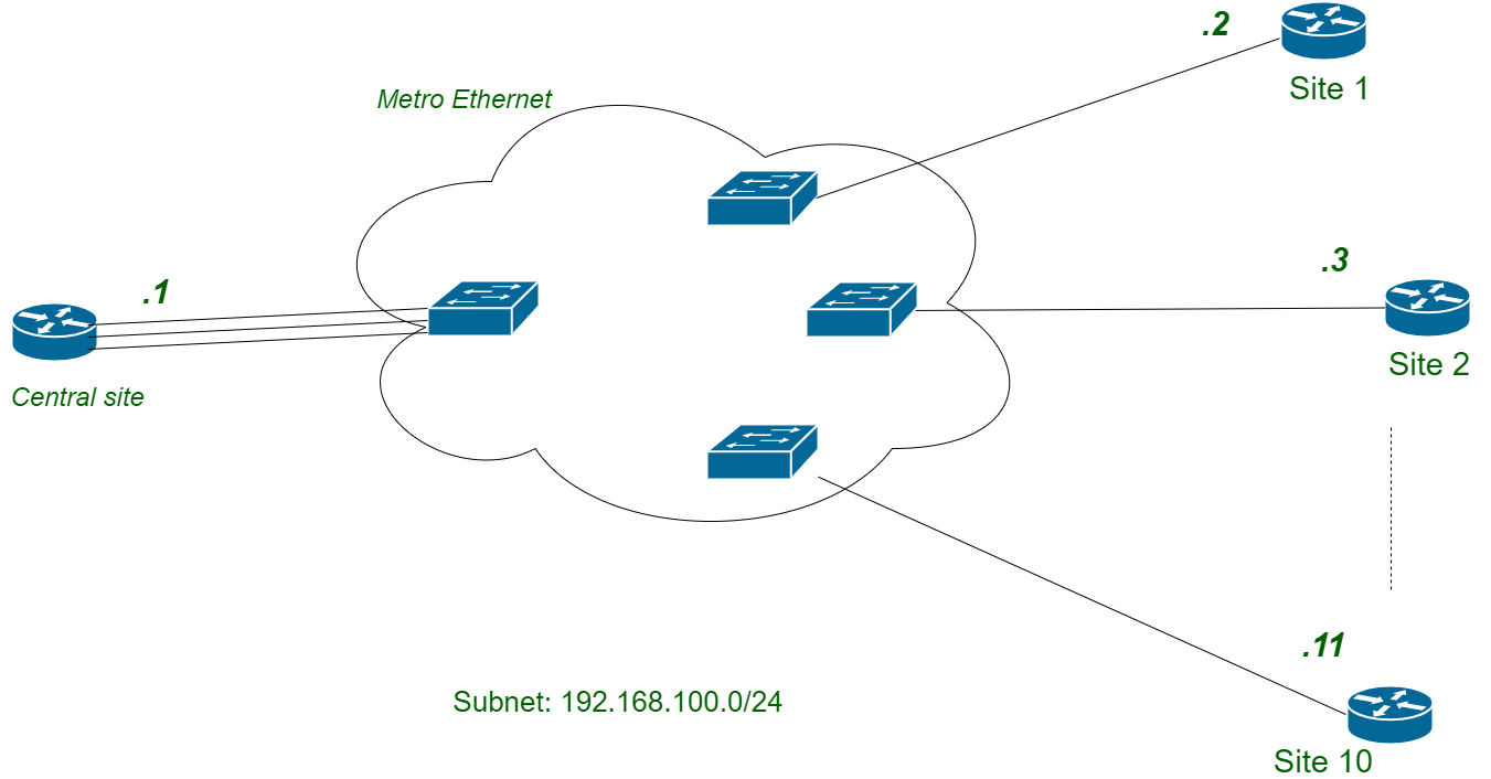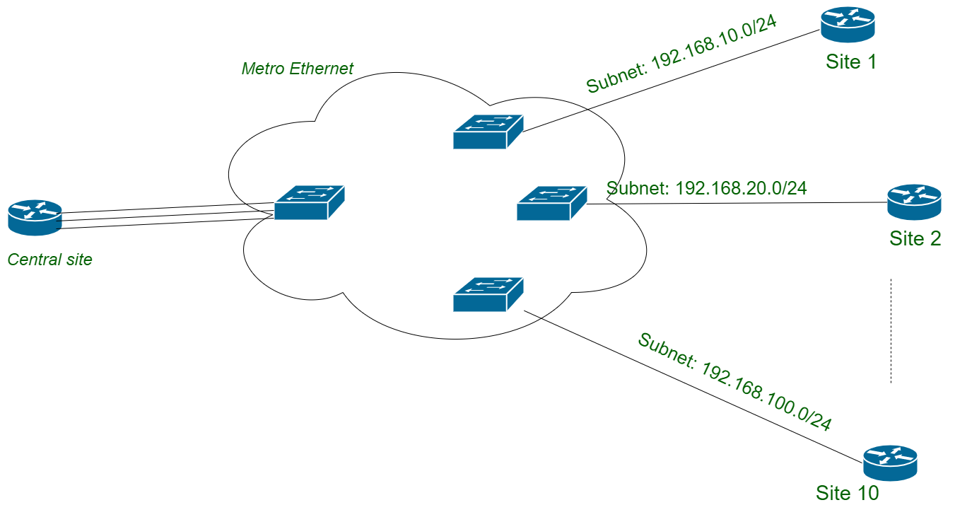 图 –以太网线路服务存在多种不同的实现方式。假设有一个企业,它有一个总部以及10个远程站点。如果该企业想要使用以太网线路服务,那么就需要在10个远程站点与总部之间建立10条独立的以太网线路。这种实现方式与“E树”服务类似,但实际上两者还是有一些区别的。在“E树”服务中,所有这些连接都位于同一个子网内;而在以太网线路服务中,这10条连接则分别位于10个不同的子网中。