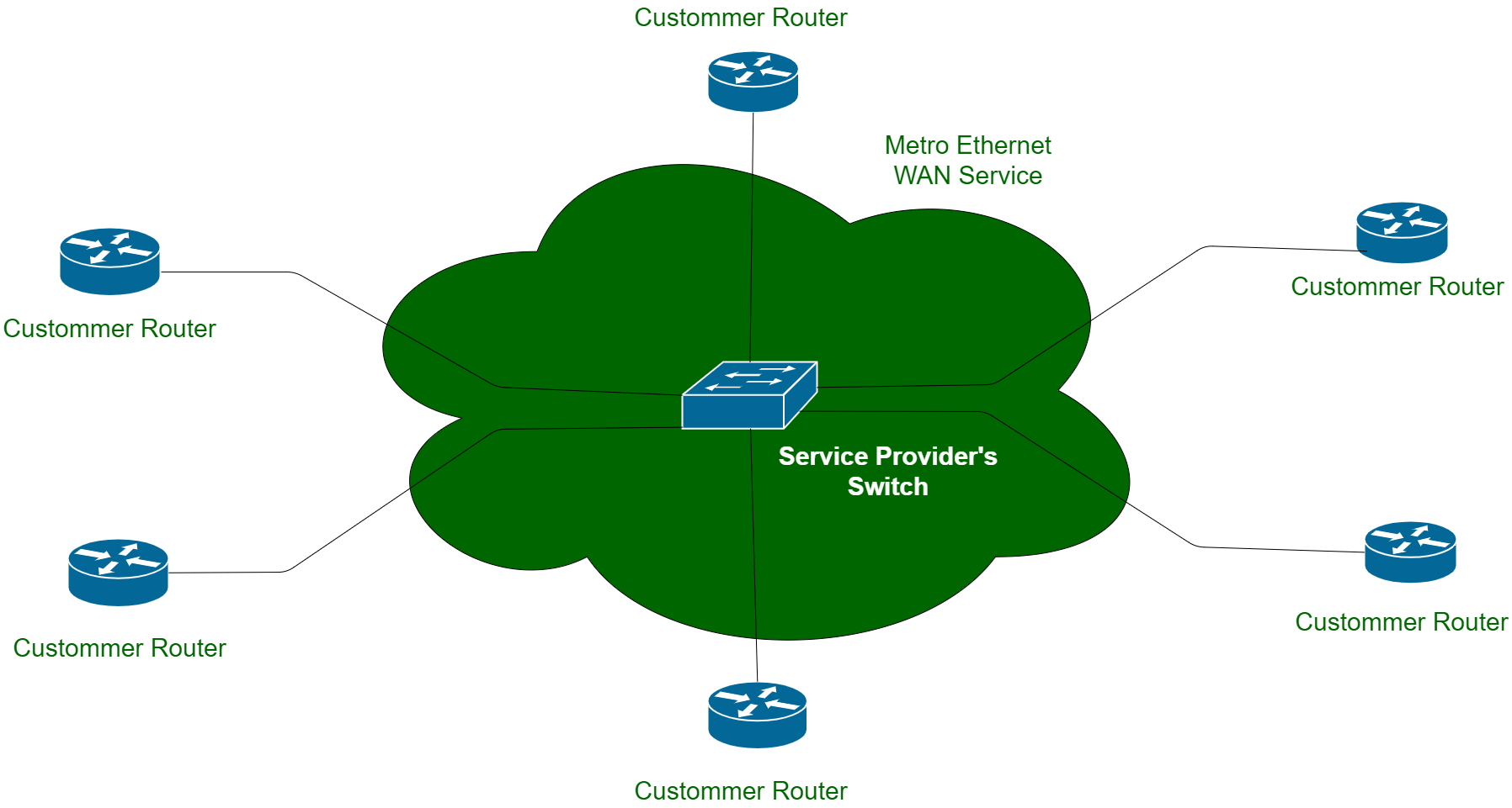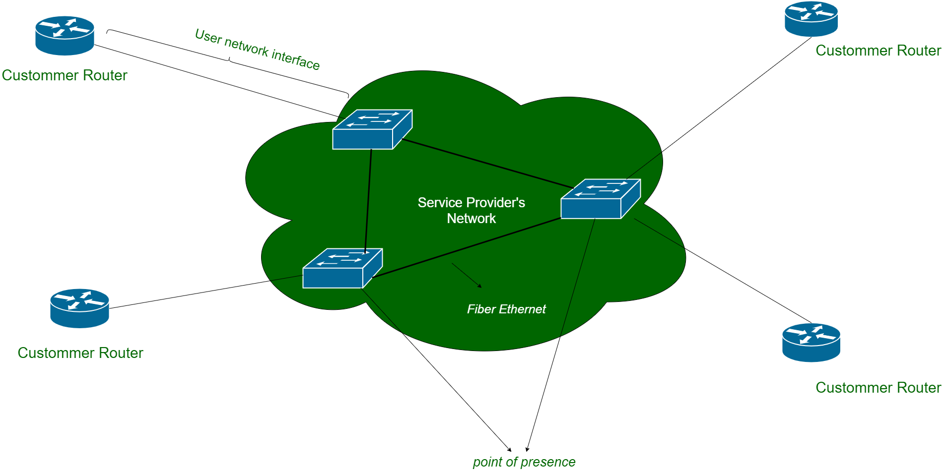 图 –地铁以太网类比地铁以太网实施:如果我们从客户/企业的角度来看,那么每个站点都必须与服务提供商的网络相连。 此外,没有必要直接连接两个企业站点,因为这就是企业选择使用Metro Ethernet的原因。 对于任何企业来说,仅仅为了连接各个分支机构而铺设以太网电缆穿过城市之间都是不可行的。 从服务提供者的角度来看,他们需要在那些可以被大量客户访问的地点安装交换机。 这个地方被称为“接入点”。 选择PoP的位置时,会考虑到客户的以太网标准是否能够承受这样的传输距离。 客户与服务提供商的设备之间的连接被称为用户网络接口(UNI)。 “用户”指的是客户,而“网络”则指服务提供商的网络。