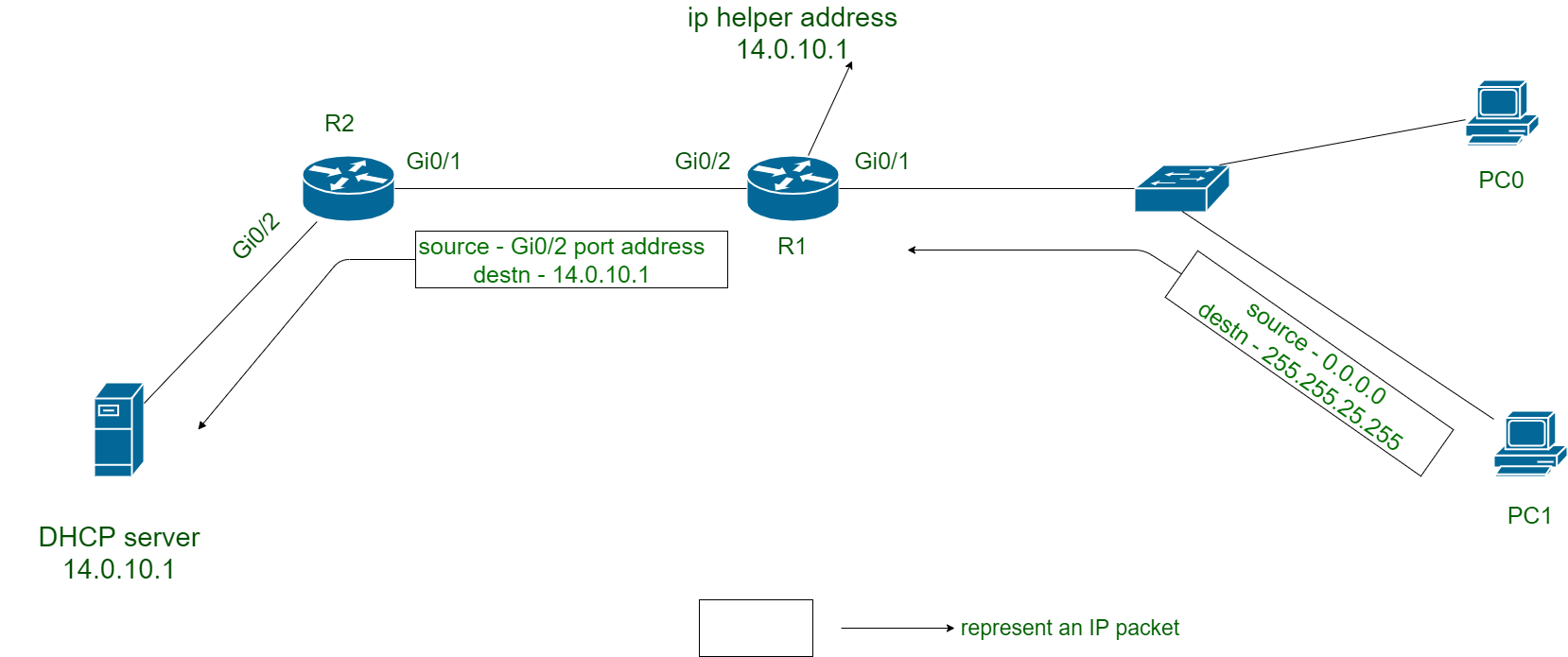 - 现在,R1接收到了IP数据包,并将目标地址更改为DHCP服务器的地址,即14.0.10.1。同时,发送地址则被设置为R1自身的出接口地址,即Gi0/2接口的地址。R1之所以这样做,是因为它已经配置了IP辅助地址。