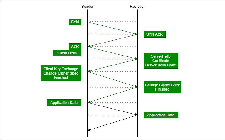 图 –TLS握手过程- 在支持TLS的服务中,发送方会发送“ClientHello”消息(如协议中所规定的那样)。该消息中包含有关客户端的信息。