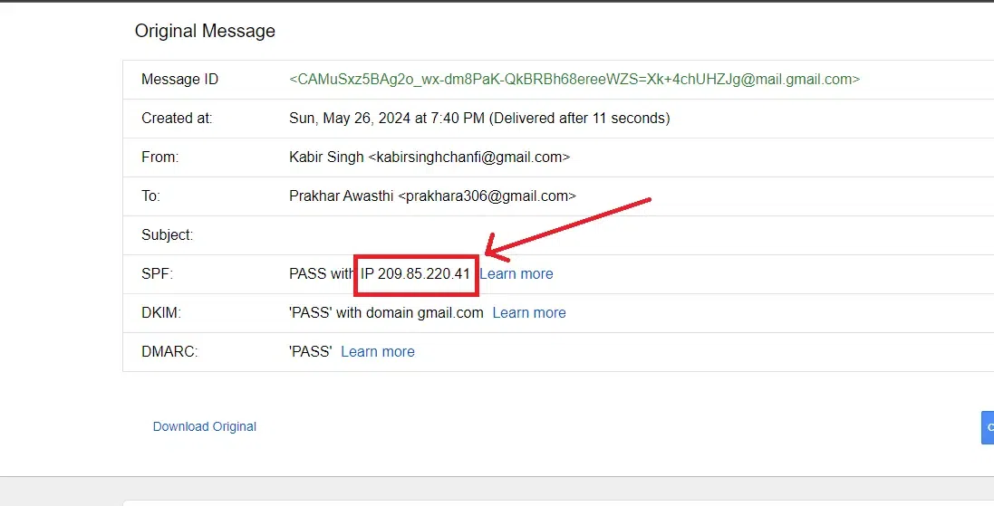 现在,发件人的所有详细信息都会显示出来,比如电子邮件地址、邮件主题以及发件人的姓名。此外,SPF行中还会显示IP地址。只需将IP地址复制下来,然后将其用于IP定位工具中,就可以追踪到发送邮件的服务器了。