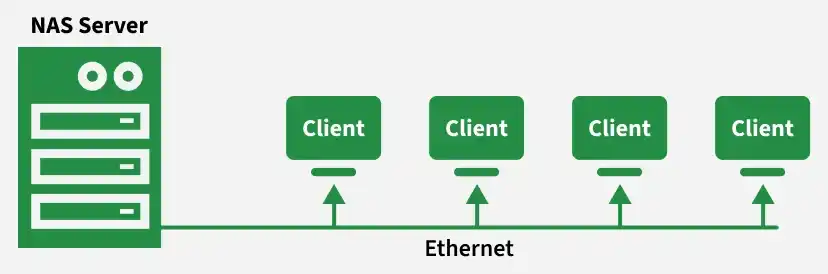 这是一种简单的NAS架构,它表明存在一种中央存储系统以及多个用户。