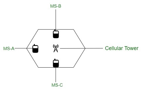 蜂窝网络或移动网络是一种无线电网络,它分布在被称为“小区”的区域内。每个小区至少由一个固定位置的收发器来提供服务,这种收发器被称为基站或基站站点。目前,所使用的远程通信系统就是基于这种蜂窝网络的。GSM/CDMA/HSPA/LTE属于基础型通信技术。蜂窝网络由基站和手机这两个基本组成部分构成。当用户A需要与用户B进行通信时,通信过程是通过基站来完成的,如图中所展示的那样。整个网络结构呈现出六边形模式。