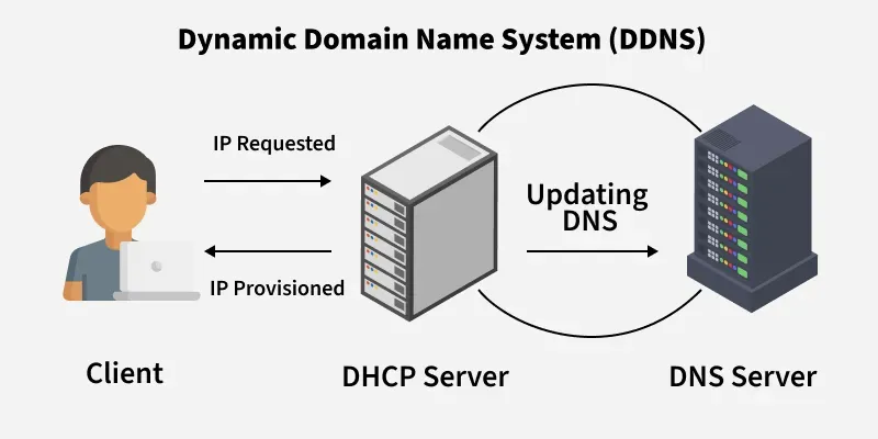 一旦某个设备的IP地址被分配好了,那么……DDNS客户端(通常被集成在路由器中,或者作为软件来安装)能够识别新的IP地址,并发送更新请求给……主DNS服务器。