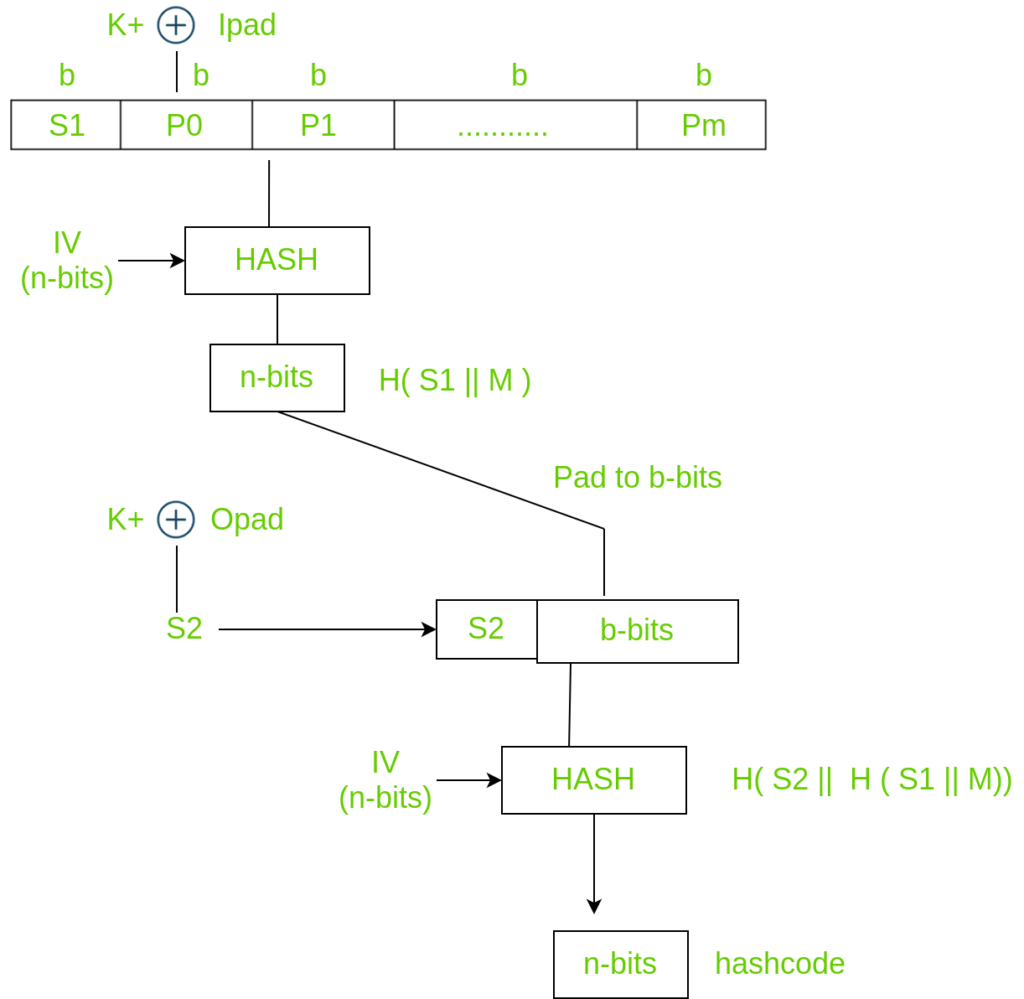 使用密钥K(0 < K < b),通过在密钥K的左侧添加O字符来生成K+。这样,密钥的长度就会达到b位。之所以不在右侧进行填充,是因为密钥的长度会发生变化。这里的b位就是明文的数据块大小。还有两个预定义的填充位,分别称为ipad和opad。所有这些操作都是在对明文消息应用哈希函数之前进行的。