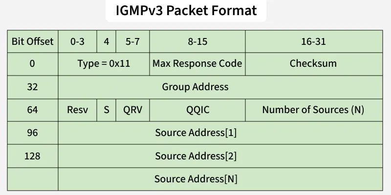 - 字段:最大响应时间、校验和、组地址、标志位(S、QRV)、QQIC、源地址列表。
