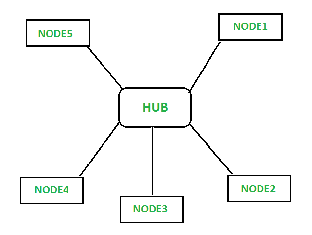 星形拓扑结构它用于局域网中,其中所有节点都连接到一个称为“中心节点”的中央点,该中心节点将各个节点连接到通信通道上。这种连接方式意味着,需要n根导线来连接n个终端设备或节点。流量是从中心节点产生的。中心站/枢纽该中心节点负责控制所有节点的通信。一个节点发送的消息首先会到达中心节点,然后由中心节点将其传输到接收节点。