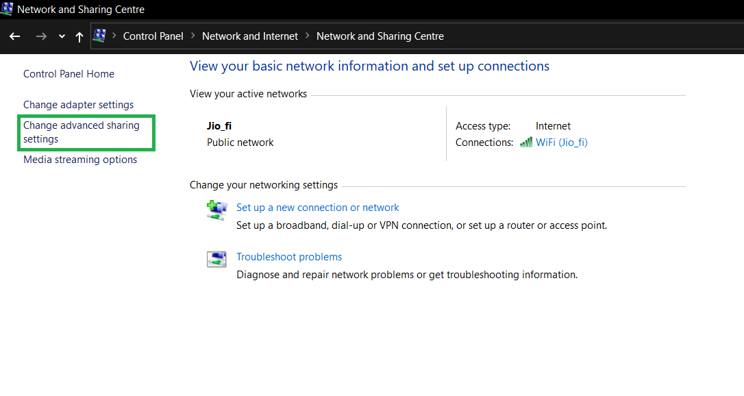 步骤7:在屏幕的左上角,选择“”。更改高级共享设置".