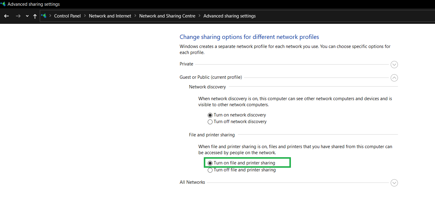 步骤8:在“文件和打印机共享”选项中,选择“启用文件和打印机共享功能选项。