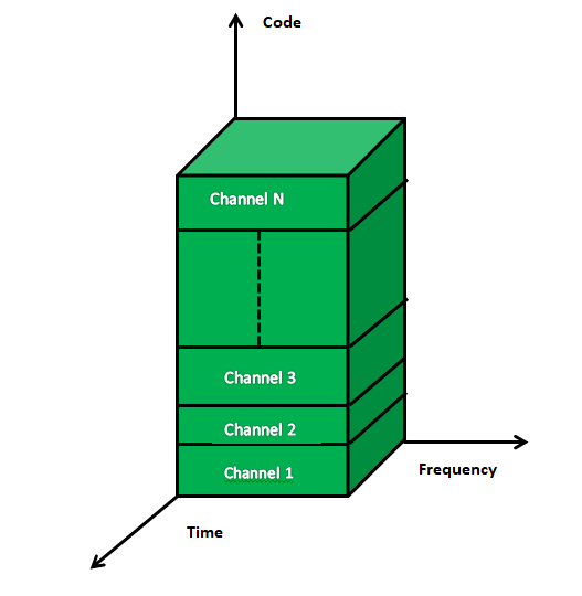 - 在CDMA系统中,所有信道都使用完整的频谱范围。