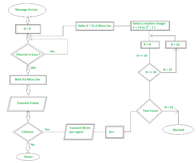 - 测试次数:如果网络处于繁忙状态,那么重新传输的数据仍有可能与其他已经重新传输过的数据帧发生冲突(或者,也有可能遇到由其他网络接口设备首次发送的新数据帧)。因此,测试次数实际上是指使用该变量进行重新传输尝试的次数。N它试图将同一帧重新传输多达15次。在传输了15次之后,该操作就会失败。注意:N的值因局域网的不同而有所差异。具体数值取决于具体的实现方式。如果N的值小于15,那么就会检查N的值是否小于10。如果确实小于10的话,那么变量……R该值将与 N 相同。但是,如果 N 的值大于 10,那么该值就会有所不同。R将会被设置为10。这说明了该值的大小为……R有效期至10点为止。