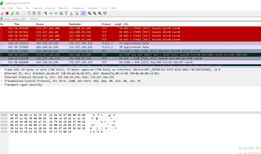 - 最上面的面板显示了源地址(IPv4或IPv6)、目标地址、源端口和目标端口号,以及数据包所属的协议。此外,还有关于数据包的其他信息。