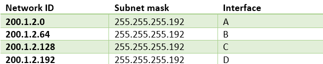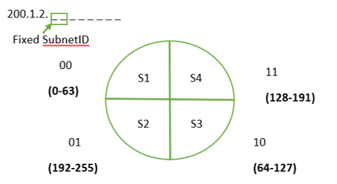 C类网络:200.1.2.0/24,即被划分为4个子网。