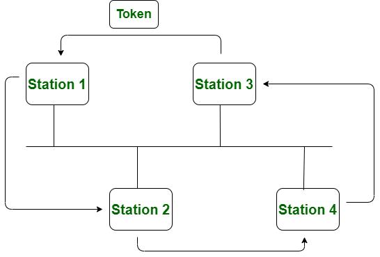 在这种情况下,虚拟环是由各个站点构成的。因此,在虚拟环的传输过程中,数据会从一个站点传递到另一个站点。令牌总线网络中的每个站点或节点都知道其前一个站点的地址以及下一个站点的地址。一个节点(即站点)只有在拥有令牌的情况下才能发送数据。它的工作方式类似于令牌环网络。