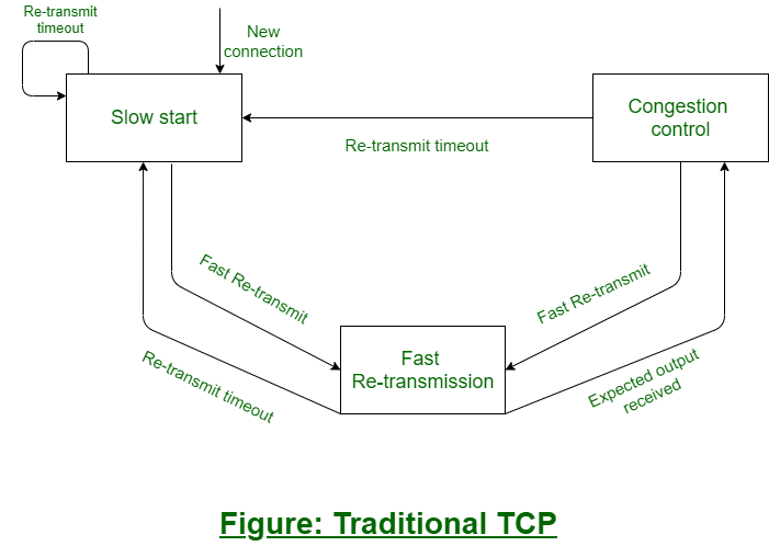 例如:假设从发送方到接收方传输的数据包数量很少,那么发送方的传输速度为2 Mbps,而接收方的传输速度则为1 Mbps。 现在,从发送方传输到接收方的数据包在网络中形成了拥堵现象。 因此,该网络可能会丢失一些数据包。 当这些数据包丢失时,接收方会向发送方发送确认消息。而发送方则需要识别出那些丢失的确认消息。 这个过程被称为拥塞控制。 现在,慢启动机制正在执行该计划。 发送方会减缓数据包的传输速度,这样一来,网络流量也会相应减少一些。 经过一段时间之后,系统会发起快速重传请求,从而尽可能快速地重新发送那些丢失的数据包。 在经历了所有这些机制之后,下一个数据包的处理过程就开始了。
