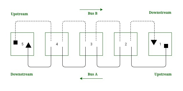 上游与下游:DQDB网络的各个站点之间的位置关系,取决于数据的流动方向。以图1中的公交车A为例,站点1和2属于相对于站点3的“上游”站点,而站点4和5则属于相对于站点3的“下游”站点。在公交车A中,站点1是公交车的起点,因为没有“上游”的站点;而站点5则没有“下游”的站点,因此可以被视为公交车的终点。工作:公交车A的头部,也就是站点1,会生成可用于公交车A使用的空插槽。同样地,公交车B的头部,也就是站点5,也会生成可用于公交车B使用的空插槽。这些空插槽会被传输到下一站点,直到数据传输站将数据写入这些空插槽中,然后目标接收方就可以读取这些数据了。
