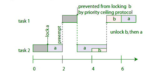 - 一个任务J,只有当该任务的优先级严格高于其他所有任务所持有的锁的优先级上限时,才能获取锁。