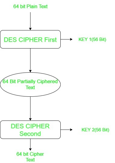 Double DES是一种加密技术,它使用两个DES加密过程来对相同的明文进行加密。在这两个过程中,分别使用不同的密钥来加密明文。解密时,需要用到这两个密钥。64位的明文首先经过第一个DES加密过程,然后被转换为64位的中间密文。之后,该中间密文再次经过第二个DES加密过程,最终得到64位的密文。
