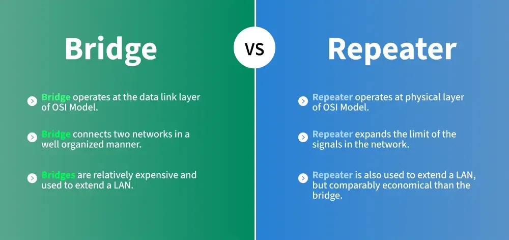 在这里,我们了解了Bridge和Repeater之间的区别。这两种设备都在维护网络性能和扩展网络覆盖范围方面发挥着重要作用,但它们的功能和复杂性却存在显著差异。Bridge主要用于流量管理、网络分段以及连接不同的网络段。 有不同类型的桥梁,比如透明桥、源路由桥、平移桥以及无线桥。每种桥梁都有其特定的应用场合。中继器的作用就是放大或再生信号,从而扩大网络的覆盖范围。 中继器的类型包括模拟中继器、数字中继器、光纤中继器和无线电中继器等。每种类型都适用于特定类型的信号和网络环境。
