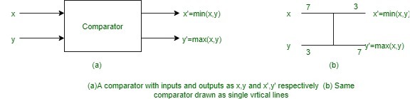 比较器通常被表示为一条垂直的直线,其中输入端位于直线的左侧,输出端则位于右侧。较小的输入值会被放在输出的上方,而较大的输入值则会被放在输出的下方。因此,可以将比较器看作是对两个输入值进行排序的过程。假设每个比较器的处理时间都是O(1),也就是说,从输入值被传入到输出结果生成之间的时间都是恒定的。比较网络的第二个组成部分就是……电线它承担着将某个数值从一个地方传输到另一个地方的功能。 这些要么是网络输入线,要么是网络输出线。 这些导线能够将比较器的输入端与另一个设备的输出端连接起来。只有当比较器的两个输入端都有数据时,它才会产生输出信号。 现在,假设每个比较器都需要单位时间来完成其工作,那么“运行时间”就可以被定义了。 运行时间,指的是在输入线接收到数值之后,输出线接收到这些数值所需的时间。 其正式定义如下: 比较网络的输入线路的深度为0。 现在,如果d1和d2分别表示两条输入线的深度,那么输出线的深度则应为max(d1, d2) + 1。 比较器的深度,指的是其输出引脚的深度。属性: