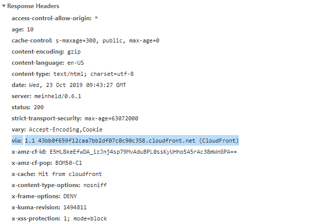 via: 1.1 2e9b3ee4d534903f433e1ed8ea30e57a.cloudfront.net (CloudFront)要查看该Via的实际使用情况,请访问……检查元素 -> 网络请检查请求头中的“Via”字段。如所示,该字段被高亮显示了。