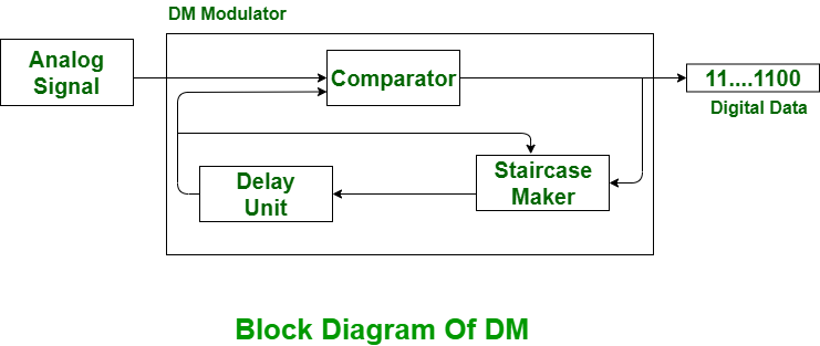 | 在PCM中,信号需要以一定的格式进行传输。编码器以及解码器双方都如此。 | 在DM中,信号可以被……调节/调整还有解调. |