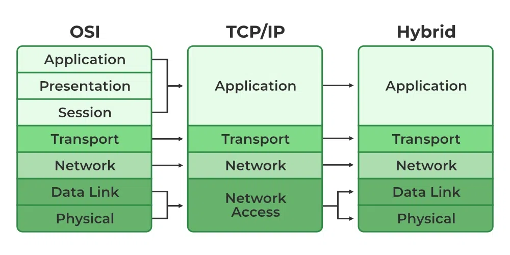在现实世界中,我们同时使用OSI模型和TCP/IP模型,这种混合模型被称为“混合模型”。在混合模型中,应用层是由OSI模型中的应用层、表示层和会话层组合而成的(这与TCP/IP模型类似)。而传输层、网络层、数据链路层和物理层则仍然遵循OSI模型的划分方式。