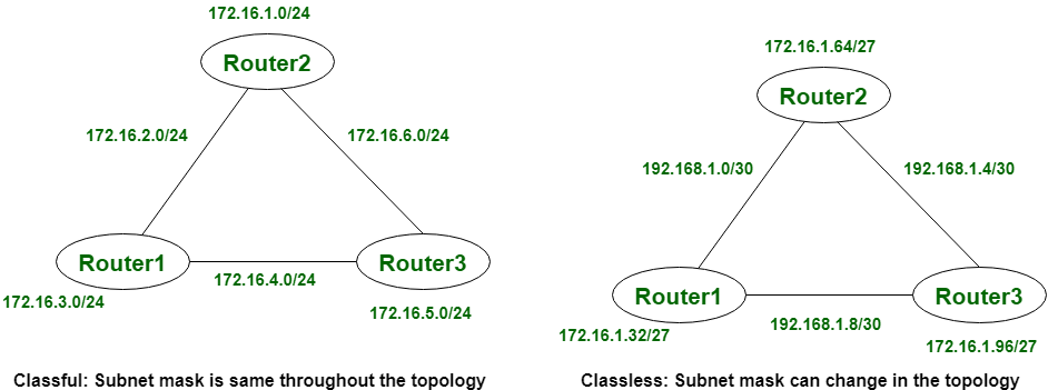 | 在类路由中,地址被分为三个部分:网络, 子网以及主持人/主办者. | 在无类路由中,地址被分为两部分:子网和主机。 |
