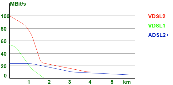 | ADSL的覆盖范围为18000英尺。 | VDSL的覆盖范围为4500英尺。 |