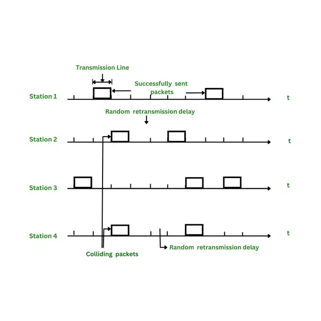“Pure Aloha”可以被视为真正的、原始的Aloha协议。每当有可用的帧时,每个站点都会发送该帧。由于通信过程中只存在一个通道,因此存在发生碰撞的可能性。