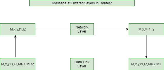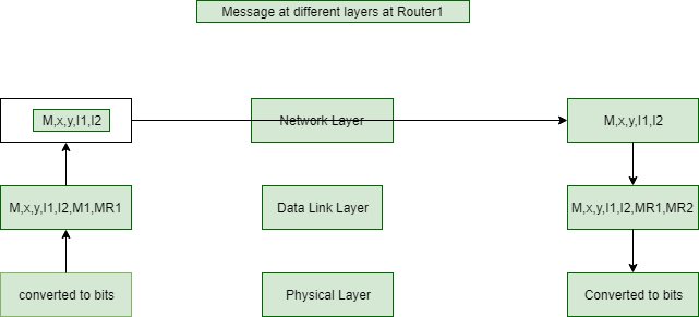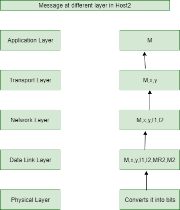 现在,网络层发现host2处于路由器2所连接的网络中,因此它会将消息发送给host2。 在网络层,当看到路由器2中存在的路由表后,系统得知host2也处于同一网络中。现在,该DLL会添加包含路由器2的MAC地址作为头部信息(发送方),以及M2的MAC地址作为头部信息(接收方)。这一信息是通过ARP请求来确定的。 现在,该消息将被转换为 (M, x, y, I1, I2, MR2, M2)。然后,该消息会被传输到物理层,物理层会将它转换成二进制数据,之后再将其发送给host2。