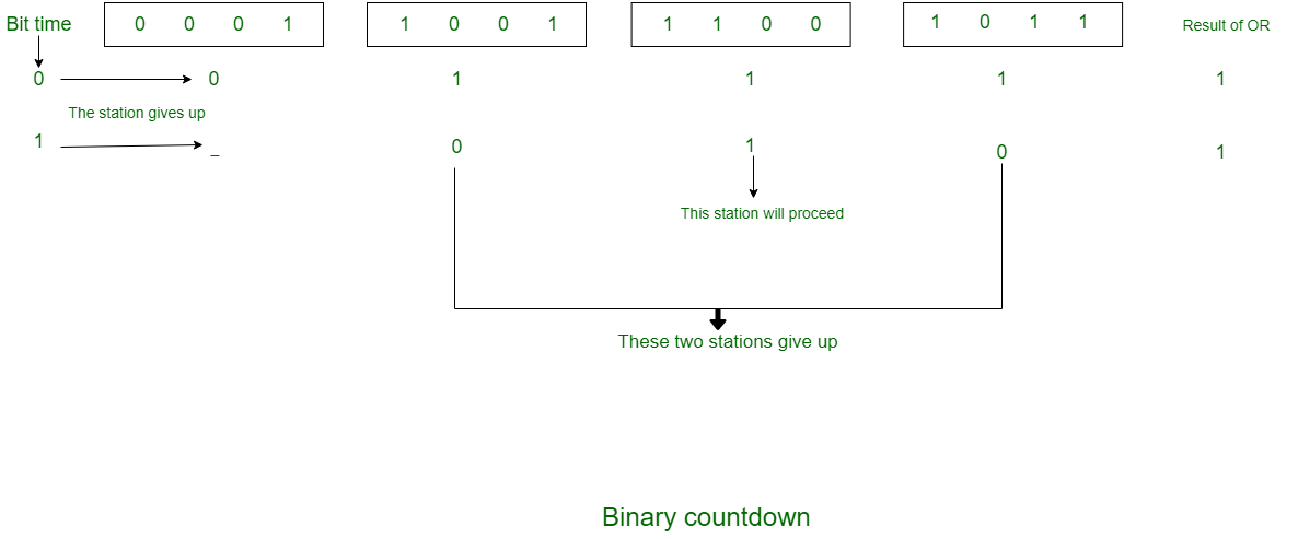 二进制倒计时协议被用来克服每个二进制站点需要额外1位比特的开销问题。在二进制倒计时中,使用的是二进制站点地址。希望使用该通道的站点会将其地址以二进制比特串的形式发送出去,且起始位为最高位。所有地址的长度都是相同的。下面,我们将通过示例来说明二进制倒计时的工作原理。