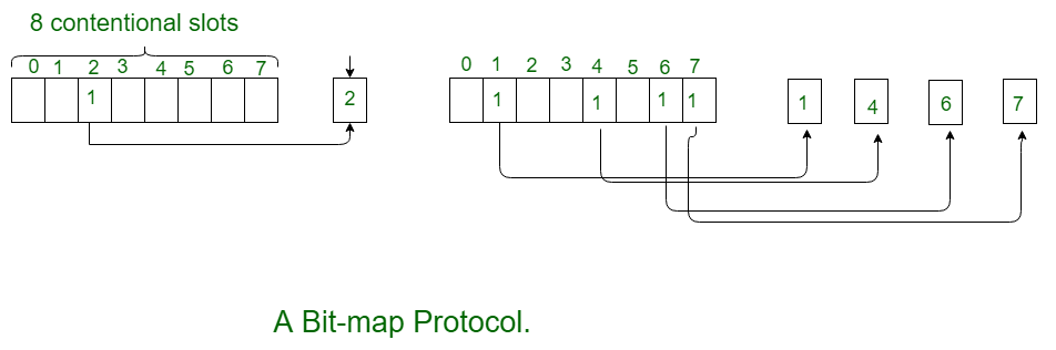位图协议是一种无冲突的通信协议。在位图协议中,每个争用周期恰好包含N个时隙。如果某个站点需要发送数据,那么它会在对应的时隙中发送一个1比特的信号。例如,如果站点2有数据要发送,那么它就会在第二个时隙中发送一个1比特的信号。