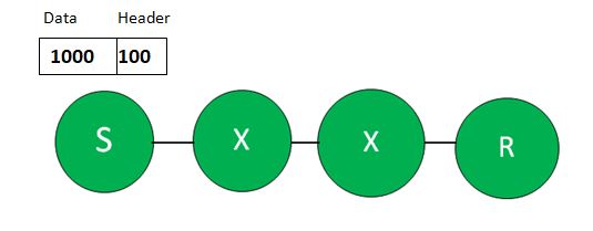 Size of the Data Packet, = Data size + Header size = 1000 + 100 = 1100 BytesTransmission delay = L/BW = 1100/10^6 = 1.1 ms Total time taken = number of Hopes * Transmission delay = 3 * 1.1 = 3.3 ms