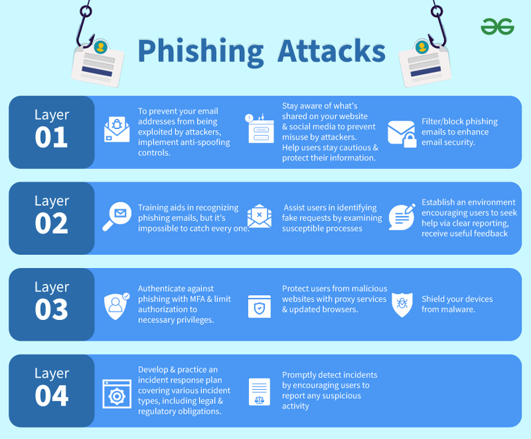 多层次的方法可以帮助您有效防范网络钓鱼攻击,同时最大限度地减少对用户工作效率的影响。这种策略提供了多种机会,可以在网络钓鱼攻击造成严重损害之前及时发现并阻止它。所采取的缓解措施也有助于应对不同类型的网络威胁。在多层次的方法中,共有四个不同的缓解层次,具体如下所示: