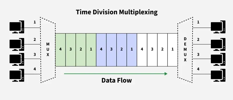 - TDM使用共享信道来传输两个或更多的数字或模拟信号。当传输介质的比特率高于需要传输的信号的比特率时,就可以使用这种方式。只需将可用的带宽划分为多个信道,每个信道都有指定的带宽即可。