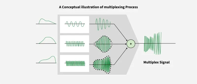 这些经过调制的信号随后被合并成一个单一的复合信号,该信号可以通过传输线路进行传输。载波频率之间有足够的带宽,以便能够容纳这些调制信号。这些带宽范围实际上就是各种信号传输所使用的通道。