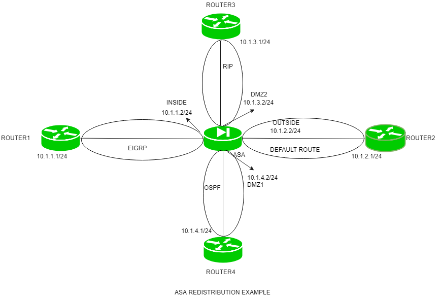 asa(config)#router eigrp 100asa(config-router)#redistribute ospf 1 metric 1 1 1 1 1asa(config-router)#redistribute rip metric 1 1 1 1 1 asa(config-router)#redistribute static metric 1 1 1 1 1