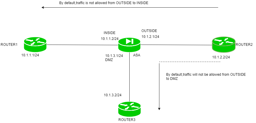 此外,如果较低安全级别的区域(例如外部区域或DMZ)想要向较高安全级别的区域发送任何类型的流量(无论是TCP、UDP还是ICMP),那么由于ASA防火墙的默认策略限制,这种请求会被拒绝。为了允许这种传输,可以使用访问列表来进行相应的配置。