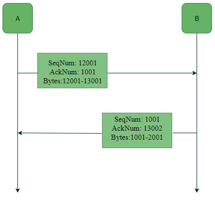 在上面的图中,如果A发送了ACK 1001,这意味着它已经接收到了最多1000个字节的数据,并且接下来会继续接收1001个字节的数据。同样地,B在接收到最多13001个字节的数据之后,也会发送ACK 13002。