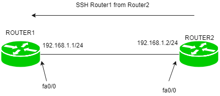 我们仍然使用相同的简单拓扑结构。Router1的fa0/0端口的IP地址为192.168.1.1/24,而Router2的fa0/0端口的IP地址为192.168.1.2/24。我们将从Router2通过SSH协议连接到Router1,然后对Router1进行SSH配置。