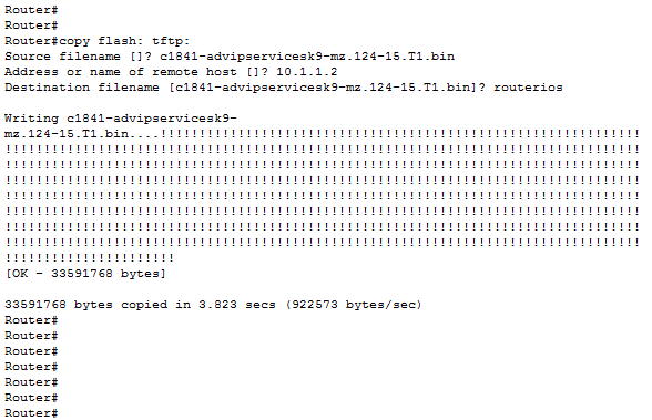 router#copy flash: tftp:Source filename[]? c1841-advipservicesk9-mz.124-15.T1.binAddress or name of remote host []? 10.1.1.2Destination filename [c1841-advipservicesk9-mz.124-15.T1.bin]? routerios