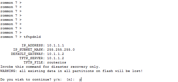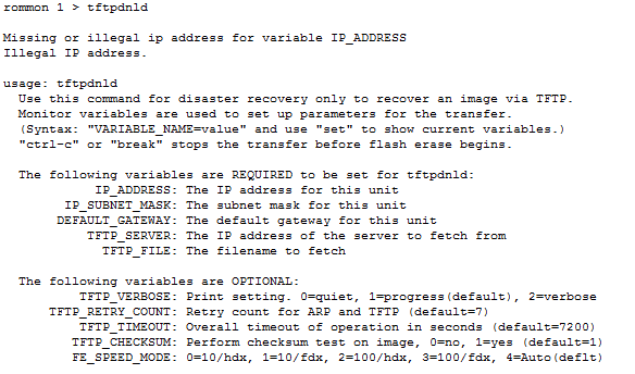 ROMMON 2>IP_ADDRESS=10.1.1.1ROMMON 3>IP_SUBNET_MASK=255.255.255.0ROMMON 4>DEFAULT_GATEWAY=10.1.1.2ROMMON 5>TFTP_SERVER=10.1.1.2ROMMON 6>TFTP_FILE=routerios