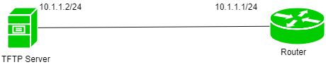 这是一个简单的网络拓扑结构,其中包含一个路由器(我们为它备份了IOS文件),以及一个TFTP服务器。路由器的IP地址为10.1.1.1/24,而TFTP服务器的IP地址则为10.1.1.2/24。