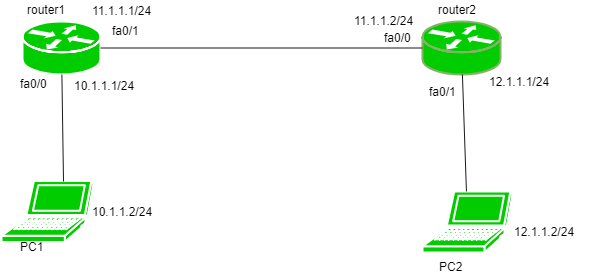 这里有两台路由器:router1,其IP地址为10.1.1.1/24,位于fa0/0接口上;另一个路由器的IP地址为11.1.1.1/24,位于fa0/1接口上。还有PC1和PC2,它们的IP地址分别为10.1.1.2/24和12.1.1.2/24。首先,我们需要通过EIGRP协议向所有路由器分配路由信息,这样PC们就能互相通信了。